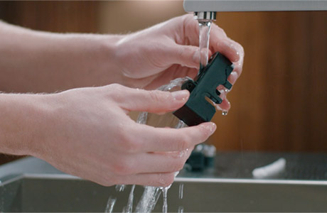 Извлеките поддон для капель и промойте его под краном с использованием моющего средства.
