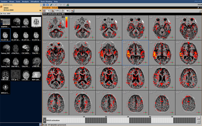 Цель: Разработка и внедрение в клиническую практику исследований сохранности проводящих путей (DTI) и основных функций мозга (fMRI) после травмы и после периода реабилитации. Описание проекта: Методика функционального МРТ [1, 2] основана на визуализации изменения кровоснабжения при функциональной активности мозга - при этом увеличивается потребление клетками кислорода, что приводит к росту концентрации окисленного гемоглобина и, как следствие, к изменениям интенсивности МРТ сигнала в зоне активации (BOLD-эффект) [3-5]. При тяжелой травме мозга фМРТ позволяет оценить сохранность основных функций мозга (движение, зрение, речь, когнитивные функции). Таким образом, необходима разработка и клиническая апробация комплекса структурных и функциональных исследований, в том числе для пациентов в бессознательном состоянии (с использованием пассивной активации). Результаты: Разработанный комплекс исследований позволяет оценить региональную активность мозга при выполнении заданий и в состоянии покоя, оценить вторичные посттравматические изменения в веществе мозга.
