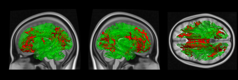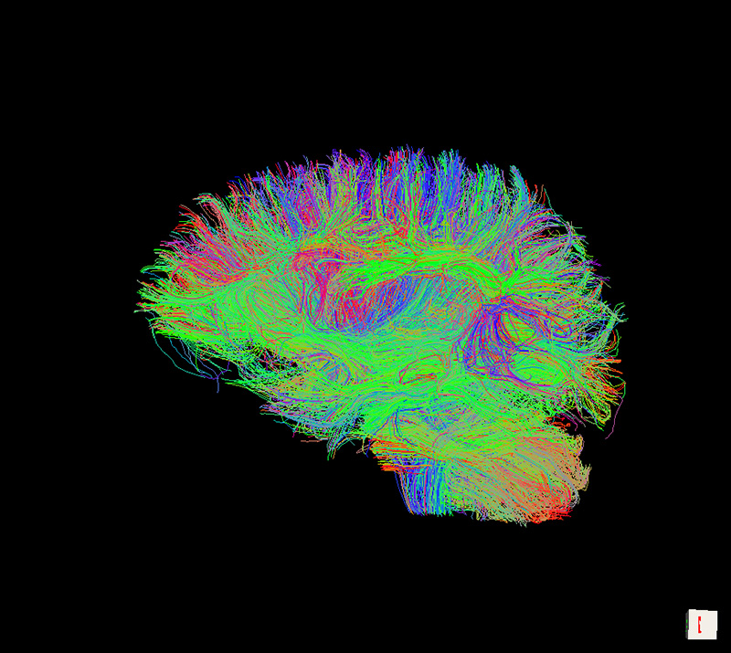 Рис. 3. Пример коннектома головного мозга, рассчитанного у одного из испытуемых (визуализировано с помощью пакета TrackVis).